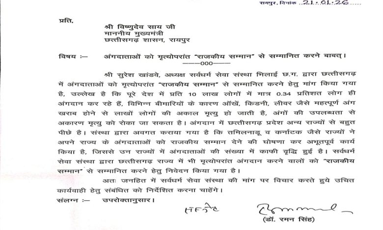 विधानसभा अध्यक्ष ने अपने पत्र में यह भी बताया कि सर्वधर्म सेवा संस्था, (छ.ग.) के अध्यक्ष श्री सुरेश खांडे द्वारा राज्य में मृत्योपरांत अंगदान करने वालों को राजकीय सम्मान दिए जाने की मांग की गई है, जिसे जनहित में अत्यंत महत्वपूर्ण बताया गया है।