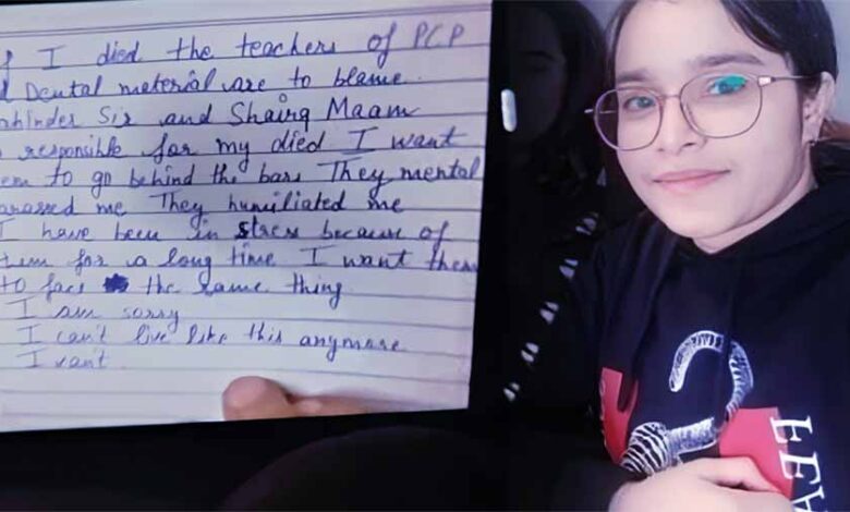 ग्रेटर नोएडा की शारदा यूनिवर्सिटी के गर्ल्स हॉस्टल में बीडीएस कोर्स की एक छात्रा द्वारा कथित तौर पर फांसी लगाकर खुदकुशी करने का मामला सामने आया है। खुदकुशी से पहले छात्रा द्वारा लिखे एक सुसाइड नोट में दो टीचरों द्वारा उसे प्रताड़ित और अपमानित करने का आरोप लगाया गया है। पुलिस ने इस संबंध में एफआईआर दर्ज कर दोनों को गिरफ्तार कर लिया है। थाना नॉलेज पार्क थाना अंतर्गत शारदा यूनिवर्सिटी के गर्ल्स हॉस्टल के रूम में बीडीएस की एक छात्रा ने शुक्रवार रात फांसी लगाकर आत्महत्या कर ली। इस घटना के विरोध में मृतक छात्रा के परिजनों और अन्य छात्रों ने यूनिवर्सिटी में जमकर हंगामा किया। यूनिवर्सिटी स्टाफ पर छात्रा को प्रताड़ित करने का आरोप लगाया।